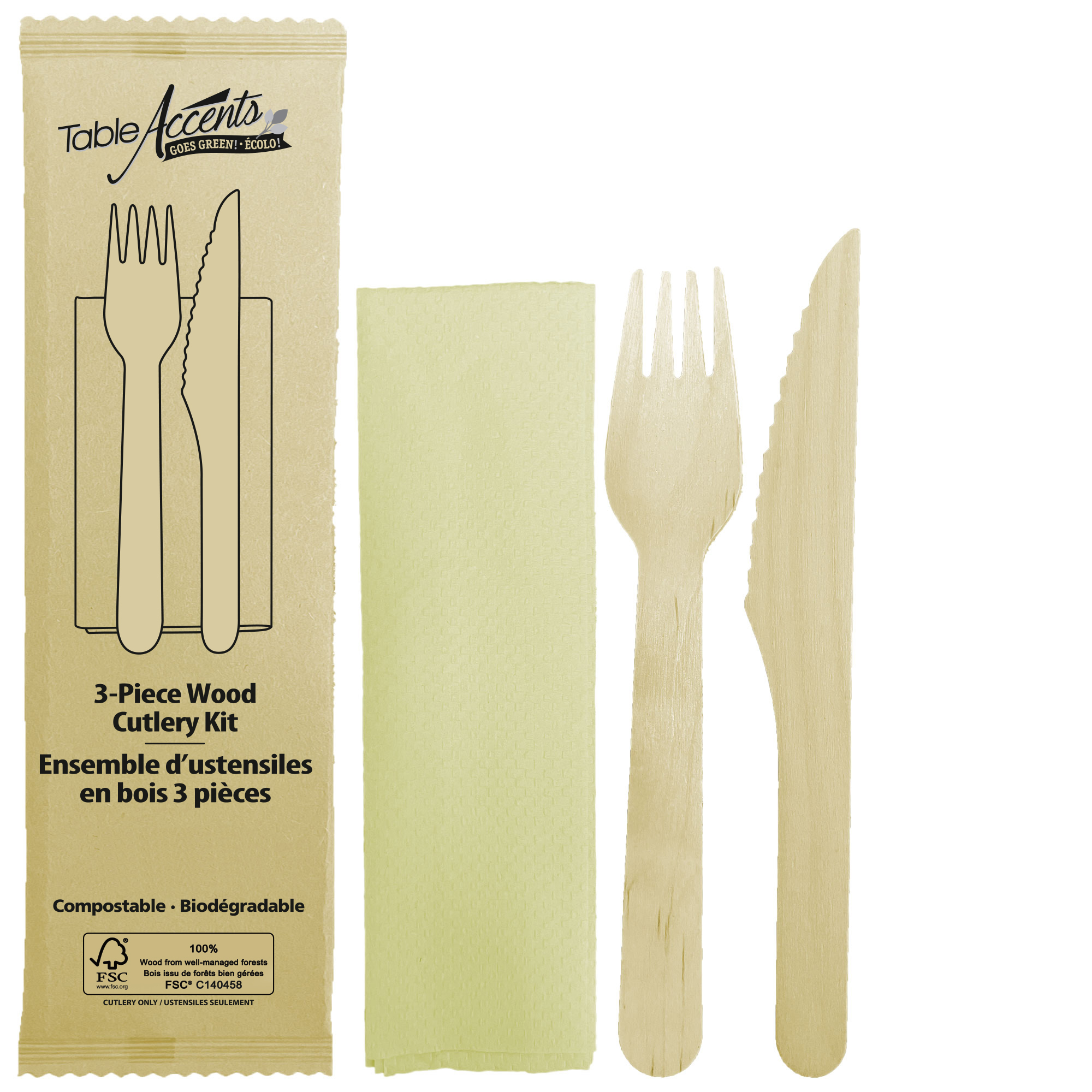 Table Accents – Birch Wood 3-Piece Food Kit – Fork, Knife & Napkin